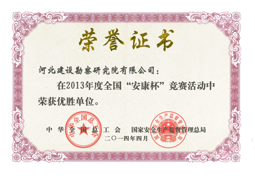 公司在2013年度“安康杯”安全生產競賽中,被中華全國總工會、國家安全生產監督管理總局評為優勝單位。這是我公司連續第十年獲此殊榮。