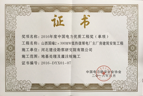 近日,我公司承建的山西國峰2x300MW低熱值煤綜合利用電廠項目獲得2016年度中國電力優質工程獎。公司領導早在項目施工期間就高度關注此項目的評優工作,對工程施工質量、工程資料整理要求極為嚴格,項目施工結束后,積極配合中國電力建設企業協會完成工程獎申報資料預審、現場復查等各項程序,最終入選中國電力優質工程獎。