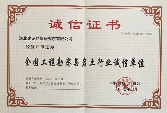 根據中國勘察設計協會5月15日發布的中設協字[2017]29號文件《關于公布工程勘察與巖土行業第一批第二批“誠信單位”復評、復審結果的通知》,我公司作為第一批271家“誠信單位”之一,通過復評審核,被審定為全國工程勘察與巖土行業誠信單位,并于近日領取了誠信證書。