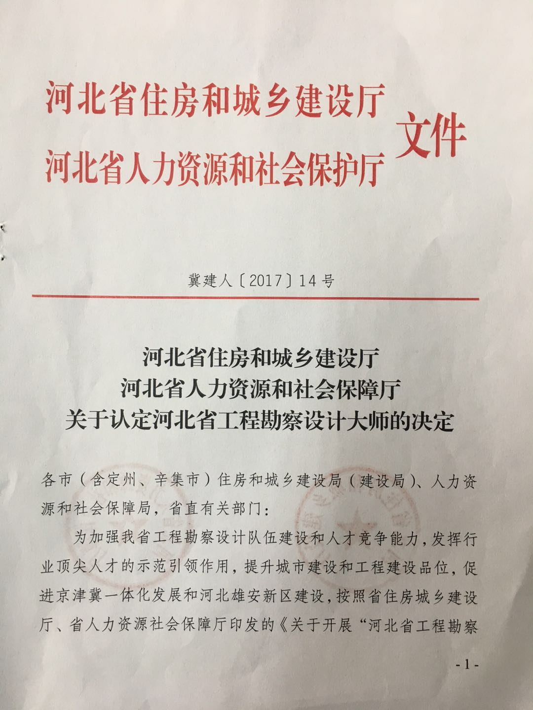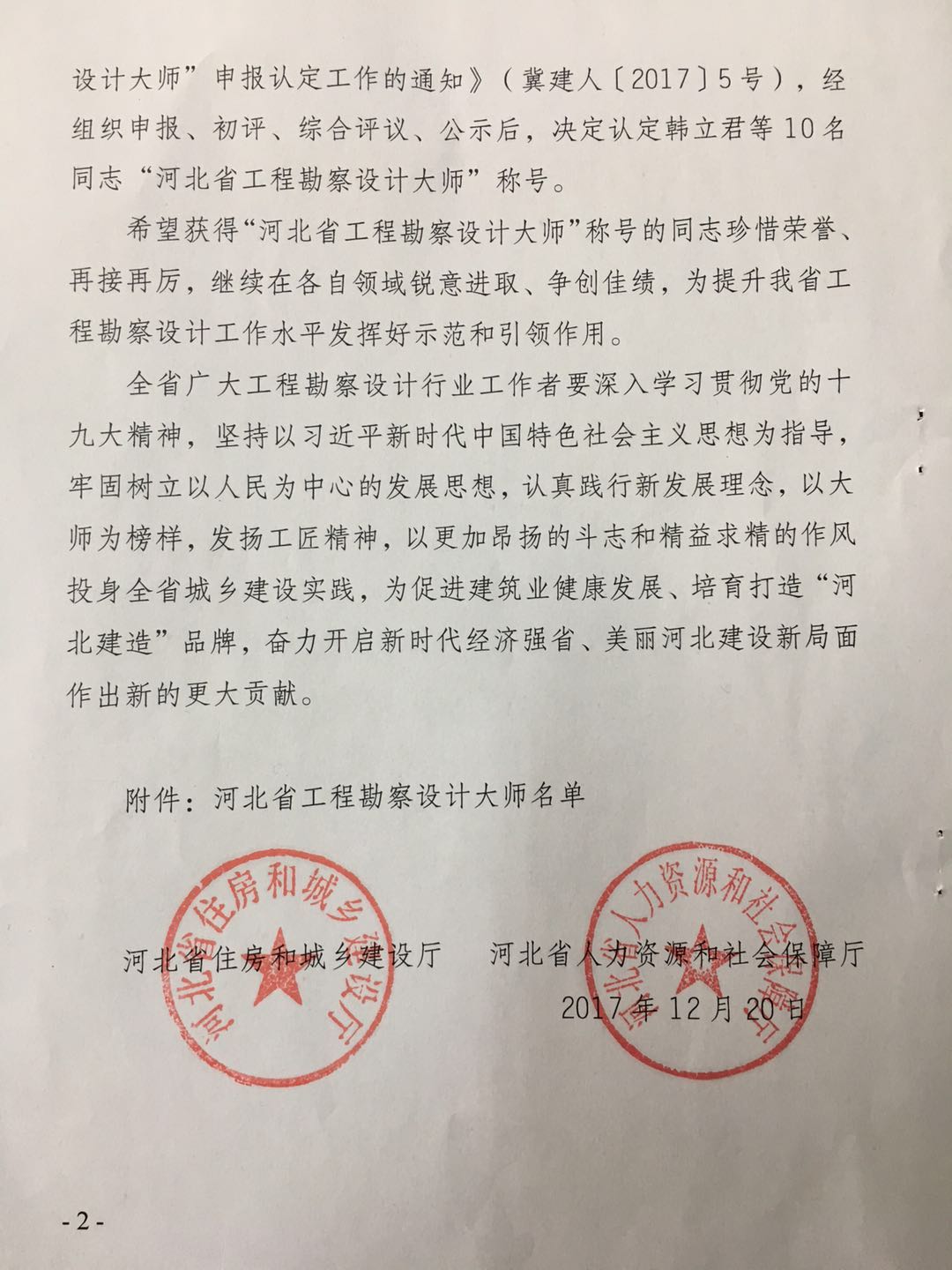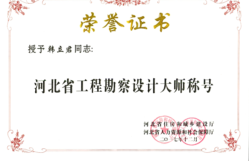 近日,從河北省住房和城鄉(xiāng)建設(shè)廳、河北省人力資源和社會保護廳聯(lián)合印發(fā)的《關(guān)于認定河北省工程勘察設(shè)計大師的決定》獲悉,公司董事長韓立君榮獲“河北省工程勘察設(shè)計大師”稱號。