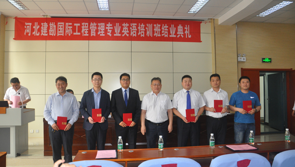 公司委托石家莊鐵道大學繼續教育學院舉辦的首屆國際工程管理專業英語培訓班(共29人,分6組),經過28天的緊張培訓,已經完成全部課程的學習。2018年5月14日下午,石家莊鐵道大學第九實驗室103教室,書聲瑯瑯,掌聲雷鳴,公司首屆國際工程管理專業英語培訓班結業典禮在這里舉行,出席結業典禮的有:公司總經理李華偉、總工程師聶慶科、人力資源部主任張軍旗及全體學員;石家莊鐵道大學副校長陳進杰、繼續教育學院院長王書海、繼續教育學院副院長楊杰、外語系黨支部書記林治華、外語系副主任李玉潔、培訓班班主任孫艷以及教師和助教。