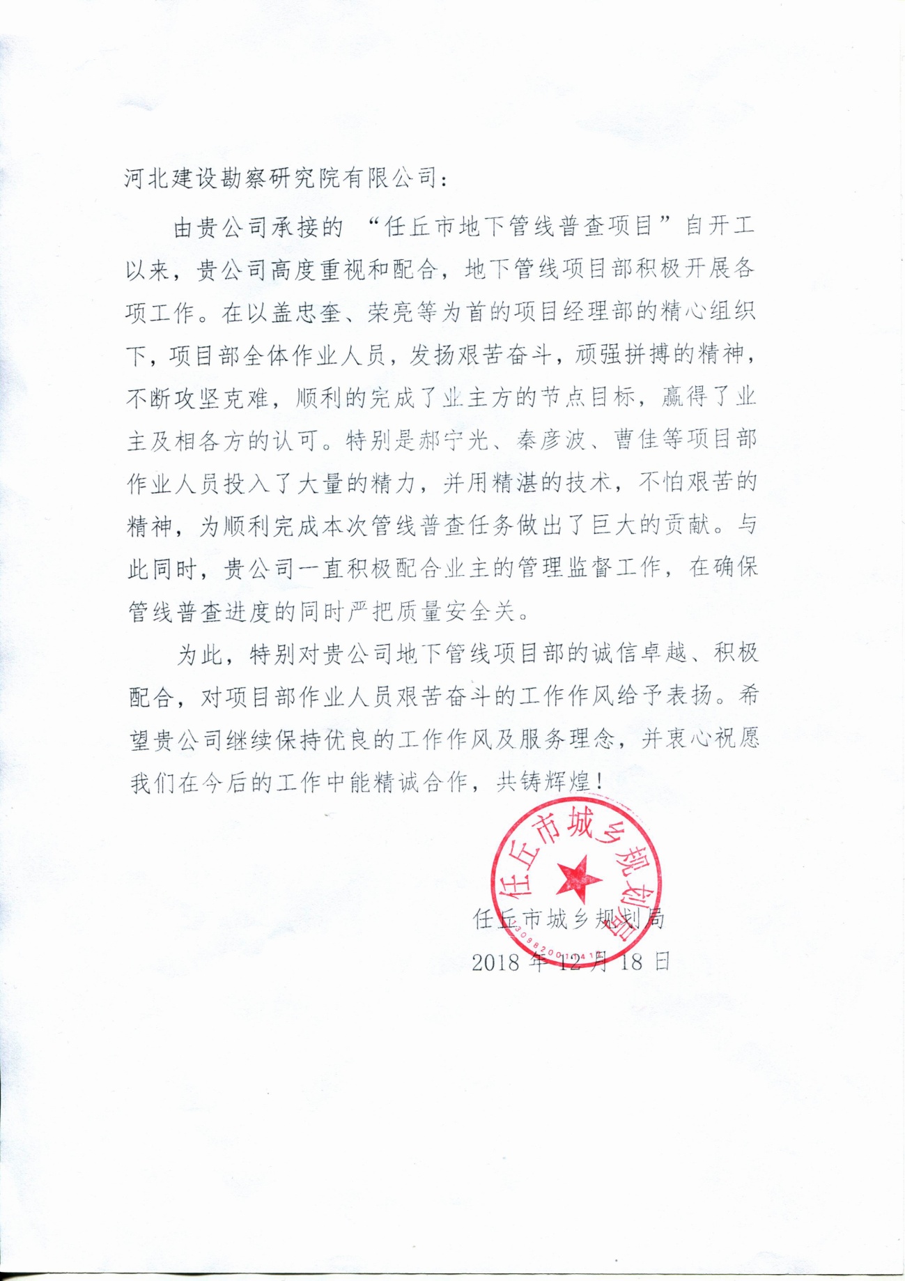 近日,公司收到辛集市城鄉(xiāng)規(guī)劃局和任丘市城鄉(xiāng)規(guī)劃局發(fā)來的表揚信,分別對我公司誠信卓越、積極配合及項目部作業(yè)人員艱苦奮斗的工作作風給予表揚。特別是在任丘地下管線普查項目中,在以蓋忠奎、榮亮為代表的項目部精心組織下,項目全體作業(yè)人員,發(fā)揚艱苦奮斗、頑強拼搏的精神,不斷攻堅克難,保質(zhì)保量提前完成了生產(chǎn)任務,贏得了業(yè)主的認可。甲方特發(fā)來表揚信,對我公司所作出的貢獻表示感謝!并希望我們繼續(xù)保持優(yōu)良的工作作風及服務理念,精誠合作,共創(chuàng)輝煌!