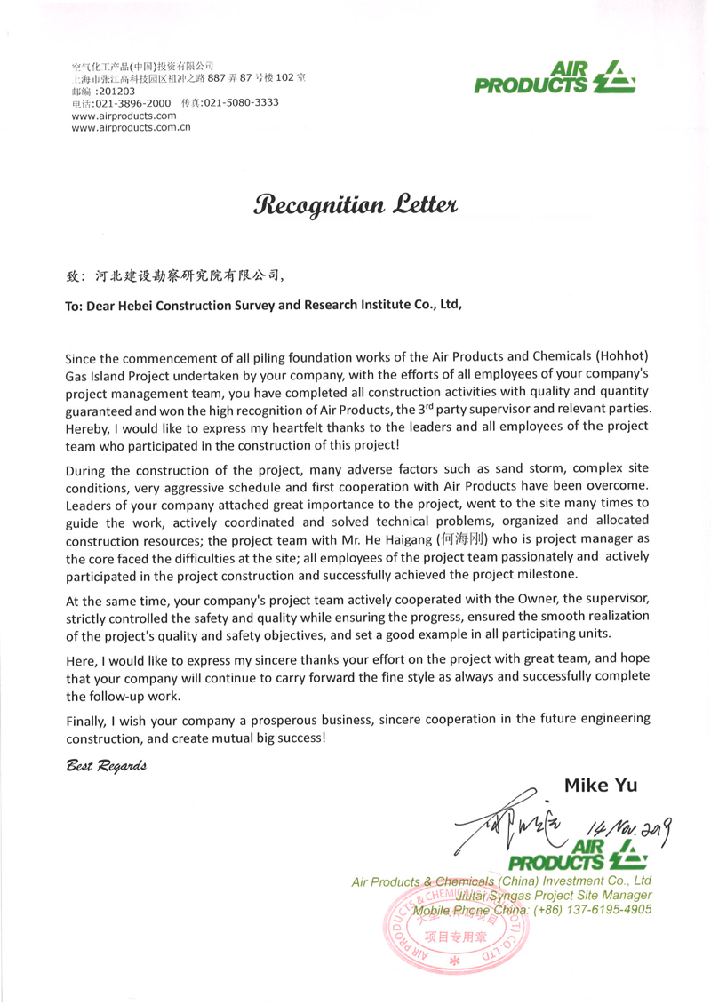 我公司承建的美國(guó)AP公司大型氣體島項(xiàng)目,安全、優(yōu)質(zhì)完成了全部地基處理任務(wù)。施工期間克服天氣寒冷、工期緊等因素,投入旋挖鉆機(jī)8臺(tái)套,一個(gè)月完成灌注樁20000立方,取得了業(yè)主的一致好評(píng)。