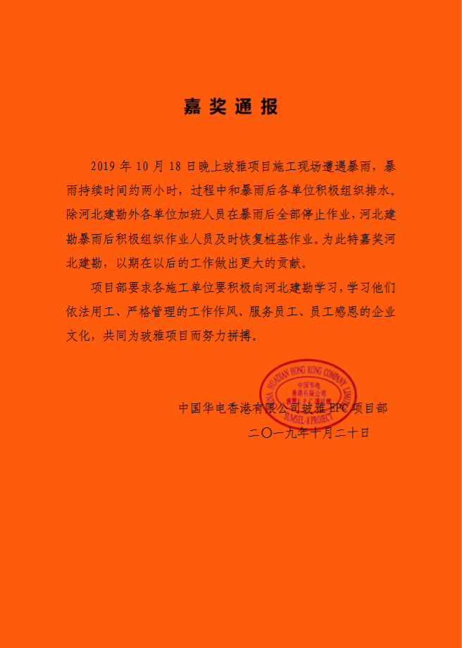 近日,華電(印尼)玻雅項目部收到中國華電香港有限公司玻雅EPC項目部發來的嘉獎通告,對我項目部負責施工的華電(印尼)玻雅2×660MW坑口電站樁基工程在施工過程中的優異表現予以表彰。