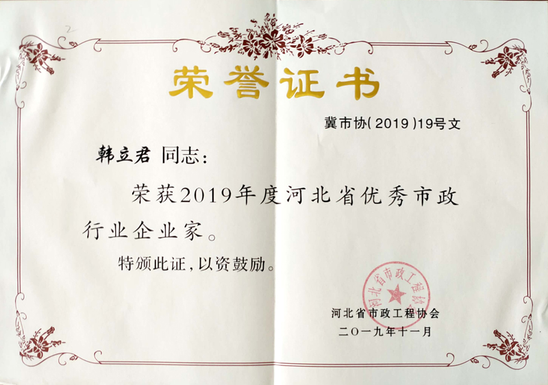 近日公司被河北省市政工程協(xié)會(huì)評為“2019年度河北省優(yōu)秀市政施工企業(yè)”;公司董事長韓立君同志獲評“2019年度河北省優(yōu)秀市政行業(yè)企業(yè)家”。
