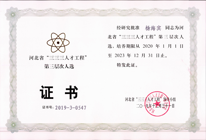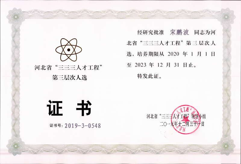 經(jīng)公司推薦,石家莊市人力資源和社會保障局組織評審,省人力資源和社會保障廳備案,我公司宋鵬波、楊海賓兩位同志榮獲2019年度河北省“三三三人才工程”第三層次人選。