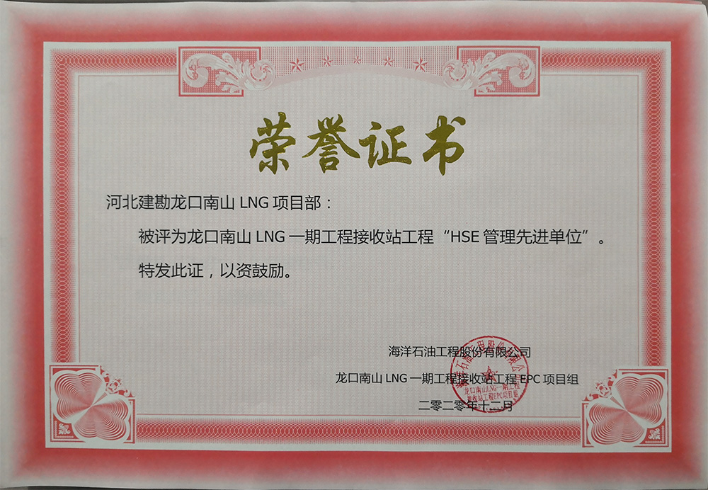 2020年12月,公司收到海洋石油工程股份有限公司發(fā)來的表揚信,對我公司在龍口南山LNG一期工程接收站工程EPC項目儲罐樁基工程標段一施工過程中,面對施工現(xiàn)場地質情況復雜、新工藝、施工難度大、氣候炎熱多雨、新冠疫情、人材機緊缺等不利因素,按合同要求順利完成了一標段1#和2#儲罐3497根振沖碎石樁和720根樁柱一體化灌注樁全部施工任務,給予了高度認可和好評,并表示感謝!我公司被評為“質量管理先進單位”和“HSE管理先進單位”并頒發(fā)了榮譽證書,同時對先進個人頒發(fā)了“優(yōu)秀項目管理者”、 “HSE管理先進個人”、 “質量管理先進個人”榮譽證書。