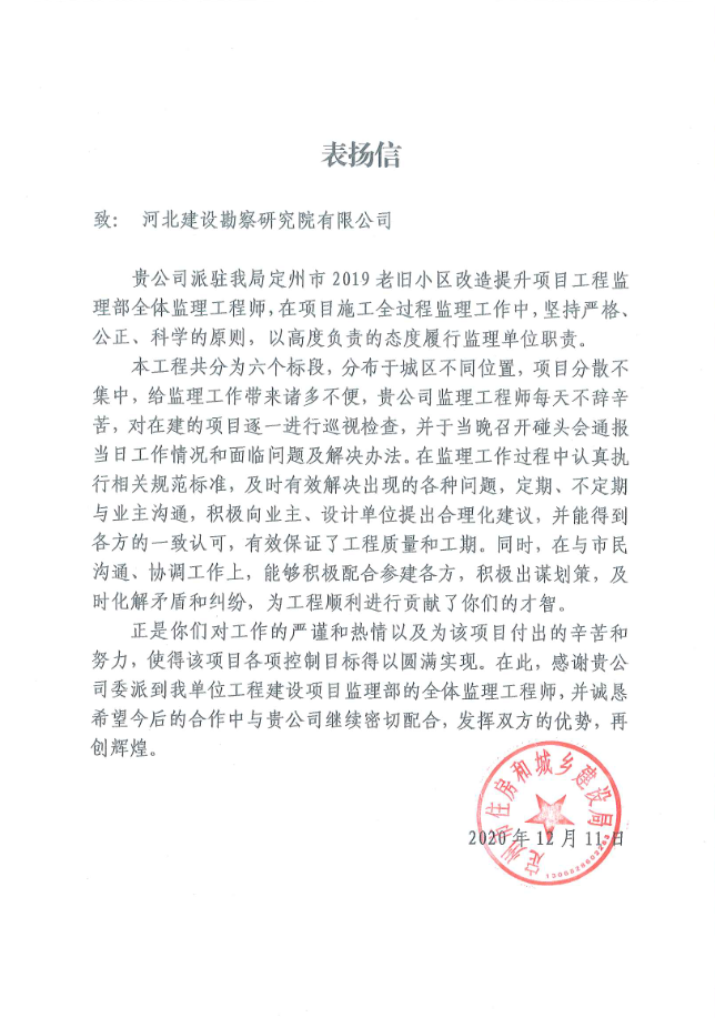 建筑設計監理公司收到定州市住房和城鄉建設局的表揚信