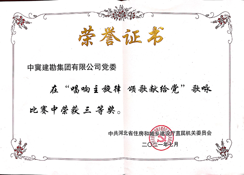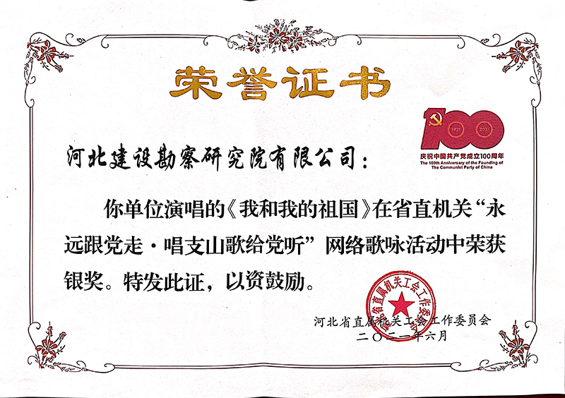 為慶祝中國共產(chǎn)黨建黨100周年,謳歌建黨百年的光輝歷程和豐功偉績,今年以來,公司開展了建黨百年系列慶祝活動,并積極響應(yīng)上級黨組織工作安排,先后參加了由省直工會組織開展的“永遠(yuǎn)跟黨走•唱支山歌給黨聽”網(wǎng)絡(luò)歌詠活動和省住房和城鄉(xiāng)建設(shè)廳舉辦的“唱響主旋律 頌歌獻給黨”歌詠比賽,用嘹亮的歌聲和飽含深情的演唱充分展示了中冀建勘人積極向上的精神風(fēng)貌,并在比賽中取得優(yōu)秀的成績。