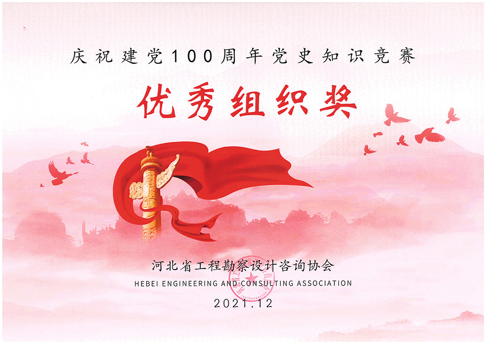 2021年,為隆重慶祝中國共產(chǎn)黨成立 100 周年,號召廣大黨員群眾進(jìn)一步了解黨的百年奮斗史,以史為鑒,砥礪前行,為行業(yè)高質(zhì)量發(fā)展作出積極貢獻(xiàn),河北省工程勘察設(shè)計咨詢協(xié)會主辦了以“重溫黨史,不忘初心”為主題的黨史知識學(xué)習(xí)競賽活動。公司黨委組織公司廣大黨員群眾積極踴躍參加,并取得較好學(xué)習(xí)效果。近日,被河北省工程勘察設(shè)計咨詢協(xié)會授予“優(yōu)秀組織獎”。