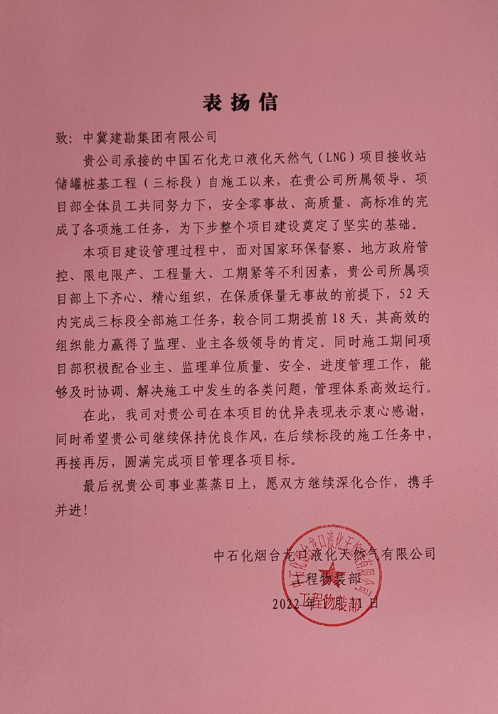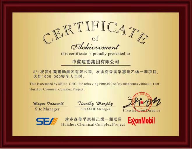 廣東惠州埃克森美孚惠州乙烯一期項目樁基工程,榮獲??松梨冢ɑ葜荩┗び邢薰炯爸袊こ探ㄔO有限公司惠州項目部“達到1000000安全人工時”優秀團隊獎,耿蕩榮獲“安全先進個人獎”。