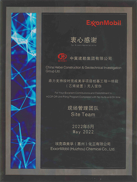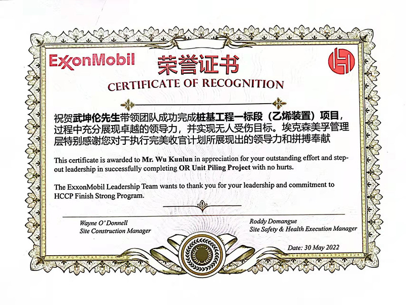 5月30日,埃克森美孚(惠州)化工有限公司召開2022年工作表彰大會,我公司參建的惠州美孚乙烯一期樁基工程項目部,在參建的30余家施工單位中以優(yōu)異的成績,榮獲“優(yōu)秀管理團隊”稱號,生產(chǎn)設(shè)備科科長兼項目經(jīng)理武坤倫榮獲 “卓越領(lǐng)導力”個人榮譽證書,項目部每位員工都收到了業(yè)主頒發(fā)的獎品。