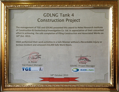 廣東大鵬LNG工程自2013年4月18日開工,至2013年9月4日完成樁基施工,10月份完成包括鑿樁頭在內(nèi)的所有現(xiàn)場施工任務(wù)。在此期間,項目部全體成員一直堅持安全第一的理念,嚴(yán)格按照總包、業(yè)主的安全文明施工要求穩(wěn)步推進(jìn)工作,得到了總包、監(jiān)理、業(yè)主的一致好評,工程結(jié)束后總包TGE為我公司頒發(fā)了安全文明施工獎狀。